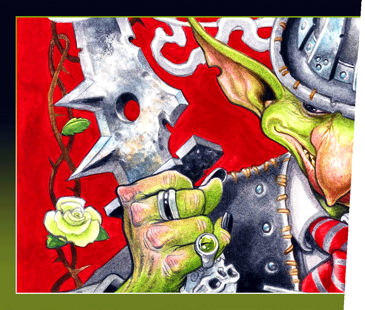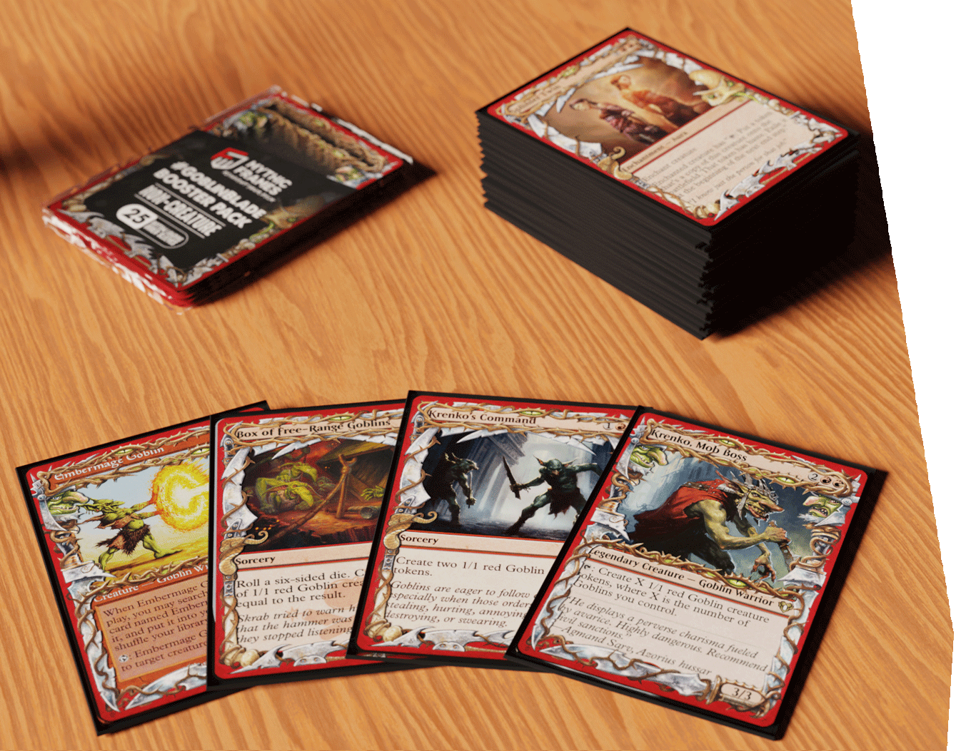 The Goblin inspired mythic frames created by Jeff Laubenstein & represented by Zbexx will have you charging the battlefield with a perverse charisma fueled by avarice. these sleeves are equipped with everything a goblin may need: weapons, armor, bones, and some snakes too!